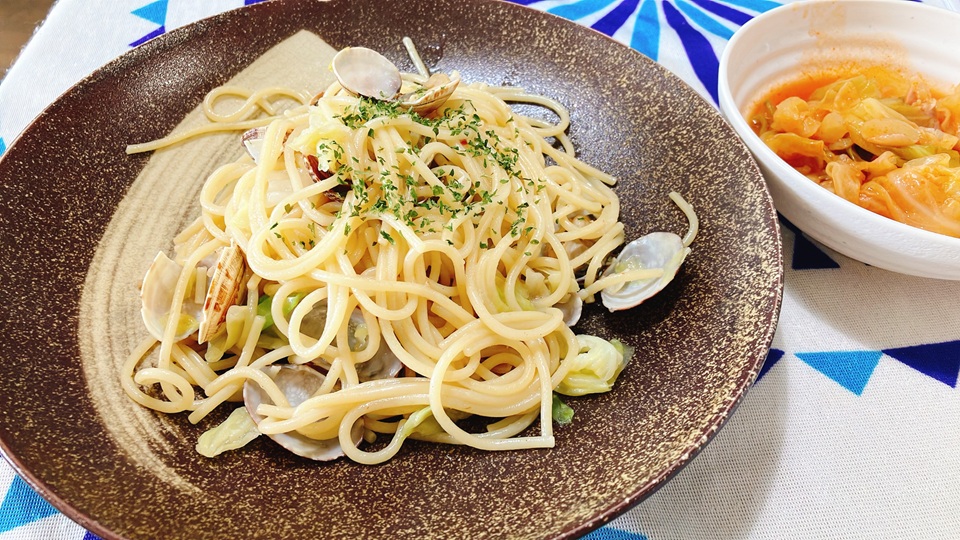 朝の残りのミネストローネと、キャベツとアサリのペペロンチーノ。ニンニクたっぷり~